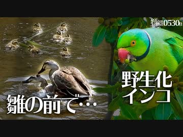 0530B【雛鳥の前でオスに襲われるカルガモ親子の母】野生化インコに食べられるビワ。引越し前に抱卵バンとにらみ合いする鴨親子、親VS親鳥 #身近な生き物語 #カルガモ親子 #ワカケホンセイインコ