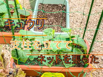 富三菜園、キュウリに支柱を立ててネットを張る。