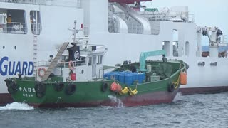 ある日の桜島(その280)<北埠頭で海上保安庁の測量船「光洋(HL-12)」の給油の模様と桜島>