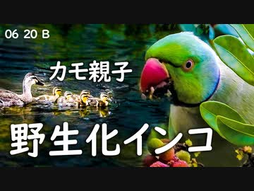 0620B【カルガモ親子と野生化インコ】大家族が引越し出戻り。雛鳥潜水。ワカケホンセイインコのオス・メス。 鶴見川水系恩田川でコンデジ野鳥撮影 #身近な生き物語 #カルガモ親子 #ワカケホンセイインコ