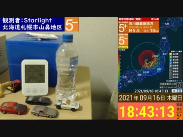 【緊急地震速報(警報)】地震観測 2021/09/16 18:42 石川県能登地方(M5.2 深さ10km) 最大震度5弱 札幌市震度0