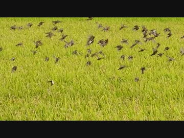 稲から飛び立つスズメ