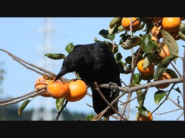 カラスが柿を食べる