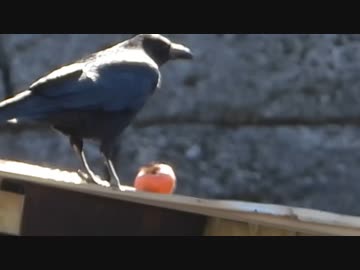 転がる柿を追うカラス
