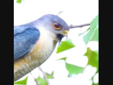 赤い目の小さなタカ。ツミのオスの目や瞬膜