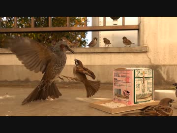 ヒヨドリを追い払うスズメ