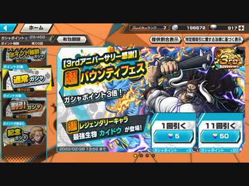ONE PIECE(ワンピース)バウンティラッシュで、3rdアニバーサリー感謝 超バウンティフェスガチャの「最強生物 カイドウ」を狙いで130連を引く動画
