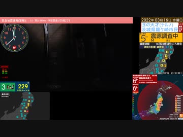 緊急地震速報(警報) 2022/3/16 23:34頃~23:46頃 福島県沖関連 最大震度6強 茨城県龍ヶ崎市最大震度4