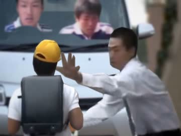 車に轢かれそうになるひでを身を挺して助けるおじさん