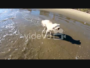 A wet golden doodle or labradoodle dog shakes off water at the beach in slow motion 江渡賢慈