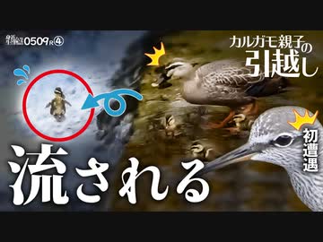 0509R④【カルガモ親子の引越し】1羽流され勇気の飛び降り。カワセミ捕食。初遭遇の野鳥キアシシギ【野鳥撮影と観察】