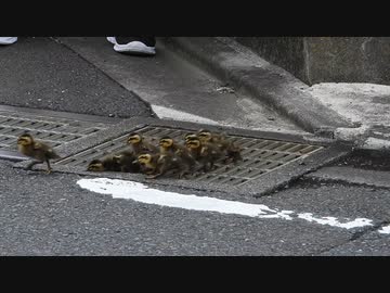 カモ親子の引越し。排水溝を渡る