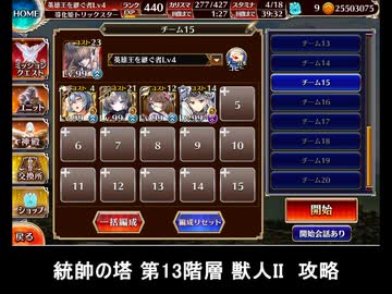 千年戦争アイギス 統帥の塔 第13階層 獣人II 攻略 110250pt