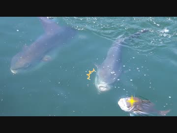 ある日のマンボウ×3匹(食事中@かごしま水族館イルカ水路)