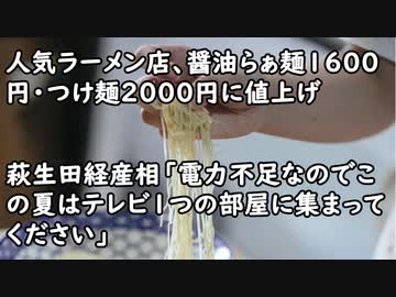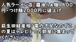 人気ラーメン店、醤油らぁ麺1600円・つけ麺2000円に値上げ 「ラーメン業界の未来のため」/萩生田経産相「電力不足なのでこの夏はテレビ1つの部屋に集まってください」