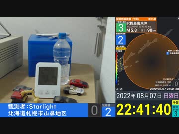 【緊急地震速報(予報)】地震観測 2022/08/07 22:41 北海道東方沖(M5.9 深さ30km) 最大震度3 札幌市震度0