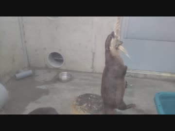 カワウソがひもにぶら下がって遊ぶ