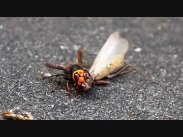 カマキリの首を取るスズメバチ