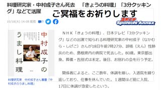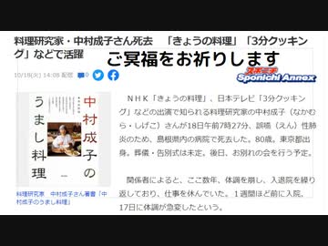 料理研究家・中村成子さん死去 「きょうの料理」「3分クッキング」などで活躍 中高年高齢者がターゲット 加齢もあり死因断定しにく