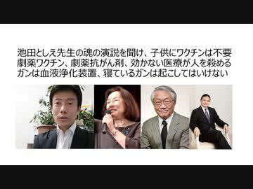 池田としえ先生の魂の演説を聞け、子供にワクチンは不要 劇薬ワクチン、劇薬抗がん剤、効かない医療が人を殺める ガンは血液浄化装置、寝ているガンは起こしてはいけない