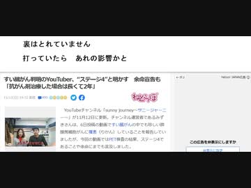 裏はとれていません 打っていたら あれの影響かと すい臓がん判明のYouTuber、“ステージ4”と明かす 余命宣告も「抗がん剤治療した場合は長くて2年」