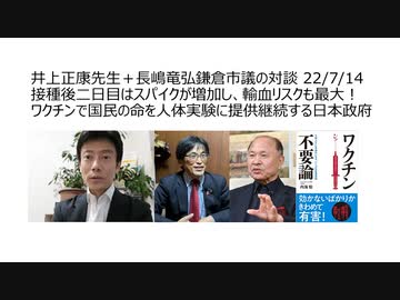 井上正康先生+長嶋竜弘鎌倉市議の対談 22/7/2 接種後二日目はスパイクが増加し、輸血リスクも最大! コロナワクチンで国民の命を人体実験に提供継続する日本政府