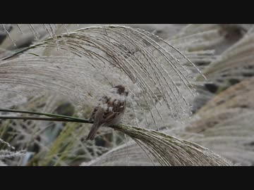 ススキを食べるスズメ
