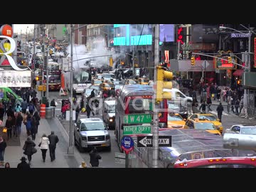 Crowds of cars busses and pedestrians in Times Square New York City 本間志伸