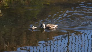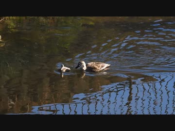 異種なかよし?カルガモとカイツブリが親子みたいだった