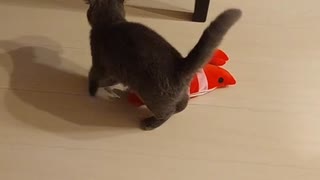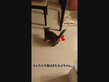 先住猫が遊ばなくなったエビで遊ぶブリティッシュショートヘアのリリちゃん