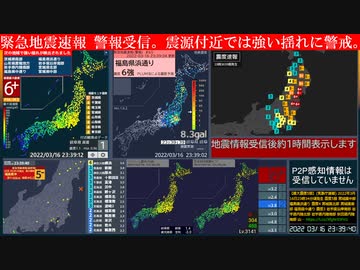 【緊急地震速報(警報)、連発、津波注意報】福島県沖 最大震度5弱+6強 M6.1+M7.4 深さ57km 2022.03/16 23:34:27.0発生 (速報値:M7.3 深さ60km)
