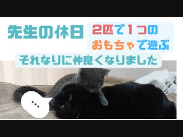2匹の猫が1つのおもちゃで一緒に遊ぶ様子