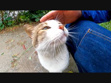 林道脇に野良猫がいたので近寄って撫でると喜んで膝の上に乗ってきた