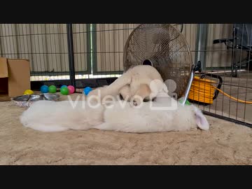 安孫子佳典 Golden Retriever Pup Walking Over Other Puppies To Lay Down Near Floor Fan