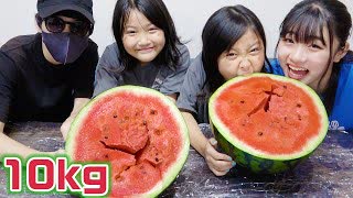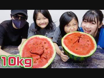 【ろこまこあこ】【大食い】スタッフさんと一緒に巨大スイカ10kgを色々な味付けで大食いしてみた!!