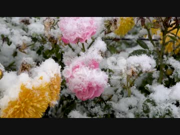 pink and yellow flowers covered in falling snow