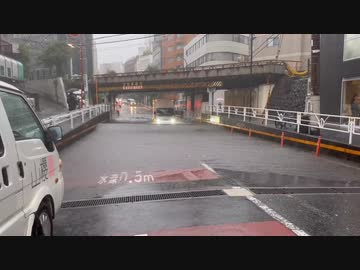 代々木の高架下が冠水し、トラックが立ち往生