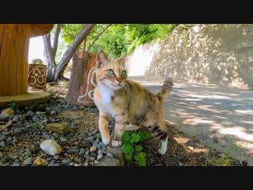 道端にある休憩所にいると猫がトコトコ歩いてきた