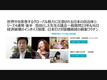 世界中を席巻するグローバル勢力に圧倒される日本の自治体シリーズ4連発 後半 池田としえ先生の議会一般質問23年6/6日 経済破壊のインボイス制度、日本だけが接種継続の劇薬ワクチン