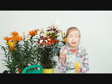 角尾直美 Flowergirl Child Blowing Soap Bubbles At Camera And Smiling With Teeth