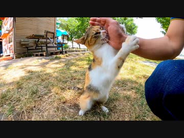 公園で出会った三毛猫ちゃん、ナデナデすると手にしがみついてきてカワイイ