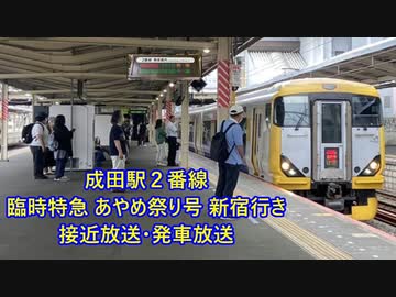 【房総新標準型放送・懐かしい戸閉英語放送付き】成田線 成田駅2番線 臨時特急あやめ祭り号 新宿行き 接近放送・発車放送(発車メロディ)「窓の花飾り」