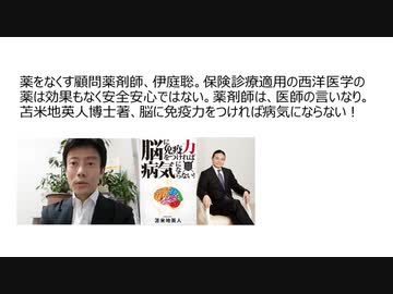 薬をなくす顧問薬剤師、伊庭聡。保険診療適用の西洋医学の薬は効果もなく安全安心ではない。薬剤師は、医師の言いなり。苫米地英人博士著、脳に免疫力をつければ病気にならない!漂う違和感の伊庭氏は維新所属