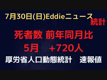 人口動態統計速報値 5月分 死亡者数と出生数 死亡は前年同月比720人ですが、2020年5月とも比べる必要がありそれが超過◯亡と考えます。増加している状態が続いています。
