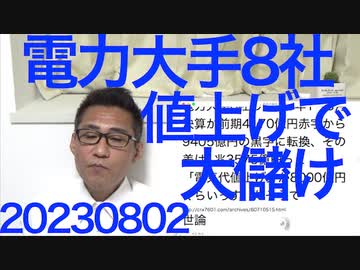 電力8社「1兆円黒字です3ヶ月間で」兵庫県知事「子供に罪は無い」朝鮮学校補助金継続、北朝鮮は「先祖の罪を子孫が償え」って日本にいまだに戦後賠償を求めてるのにおかしいぞ20230802
