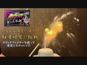 新型花火開発に向けて。『粉塵爆発』に挑戦。炎の色が変わるというマジックファイヤーも使って見た。
