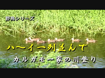 野鳥シリーズ ハ~イ一列に並んで カルガモ一家の川登り