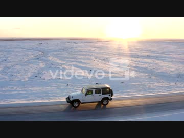 Close up following Jeep from side on snow road in Iceland at Sunset Winter, Sun, Arctic