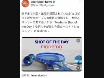 ジョコビッチ(昨年まで入国・出場が拒否)が全米オープン4度目の優勝をし、大会スポンサーのモデルナから「Moderna Shot of the Dav|モデルナが選ぶ今日のベスト・ショット/」に選ばれた