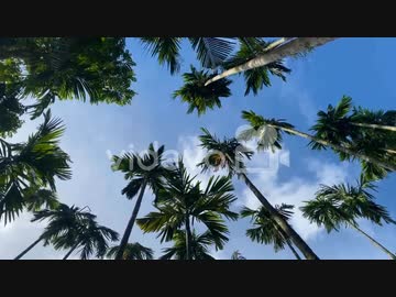 清田英輝 Low angle pov view of tropical palm tree garden with sunny blue sky